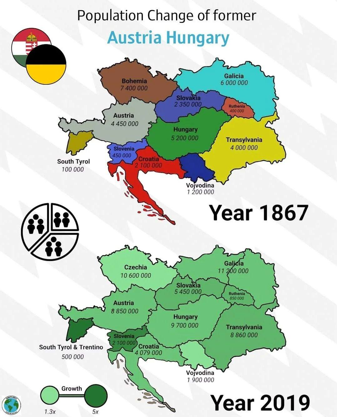 1867 vs 2019 - population growth of the former Austria Hungary.
