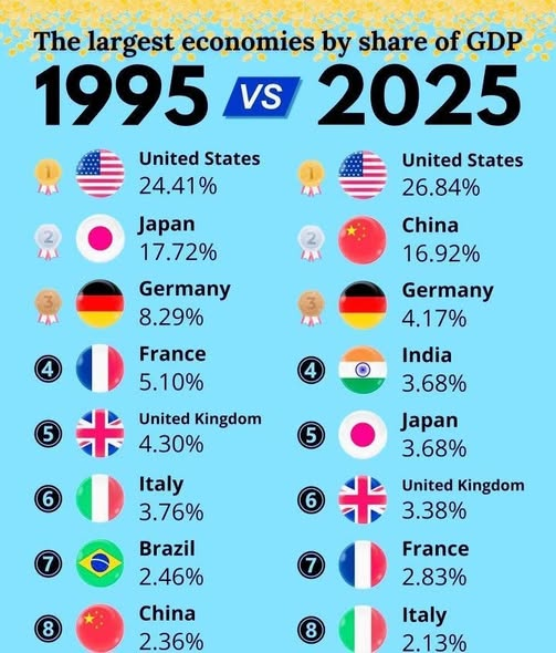 Највеће економије по уделу у БДП-у 1995. у односу на 2025. годину